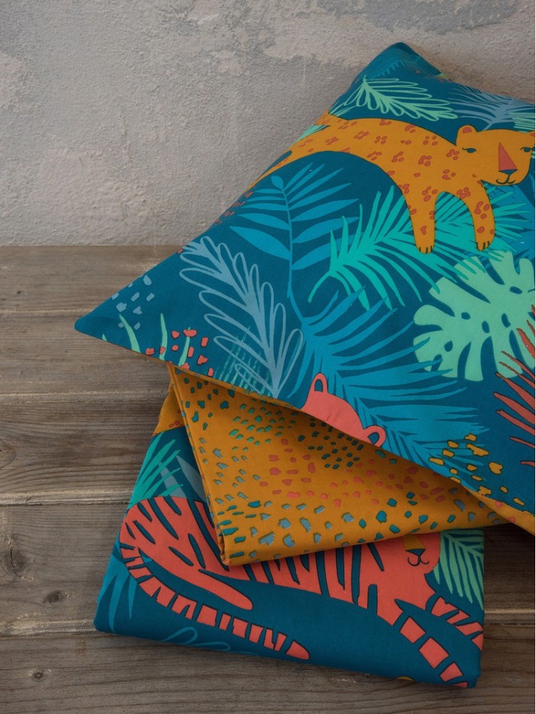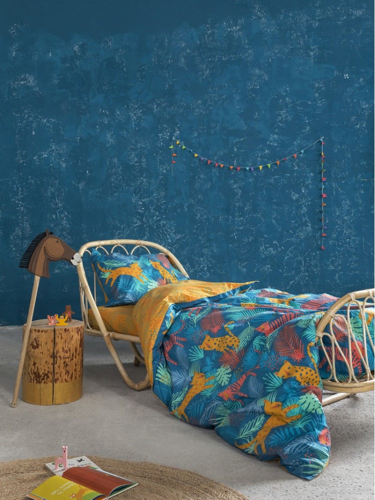 Τα παιδικά σεντόνια Bubba θα φέρουν στο παιδικό δωμάτιο τη μαγεία της τροπικής ζούγκλας. Έχουν ζωηρές μπλε αποχρώσεις που συνδυάζονται με φωτεινό κίτρινο και πορτοκαλί. Το ξεχωριστό τυπωτό τους σχέδιο με φυλλωσιές tropical jungle και όμορφα αιλουροειδή έχει αισθητική που θυμίζει εικονογράφηση παραμυθιού. Θα κερδίσουν την προσοχή των παιδιών ξυπνώντας τη φαντασία τους δημιουργικά με διάθεση για περιπέτεια, γνώση και παιχνίδι.